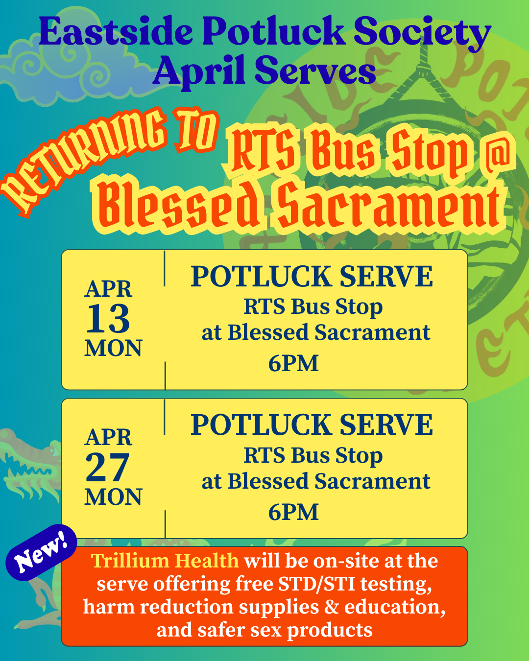 Happy Spring Rochester!! We are excited to announce that starting April 13, we will be back at our serve spot at the RTS Bus Stop at Blessed Sacrament at our old serve time of 6PM! We will be doing live serves (dishing the food out on-site). We are also really excited to be collaborating with @trilliumhealthny and their mobile testing unit to provide free STI/STD testing, harm reduction supplies, appointment scheduling, and safer sex supplies to anyone who needs or wants them. We are excited to be able to serve in the warmer weather and hope to see you very soon!